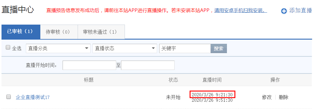 添加直播預(yù)告后,等待本站客服審核,通過(guò)審核轉(zhuǎn)入已審核列表,顯示如圖: