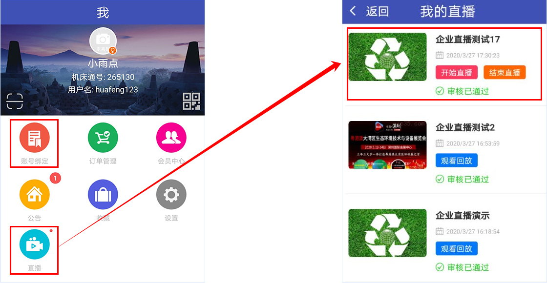 若已有本站APP進(jìn)入APP界面。同時(shí)綁定發(fā)布直播預(yù)告的賬號(hào)。
