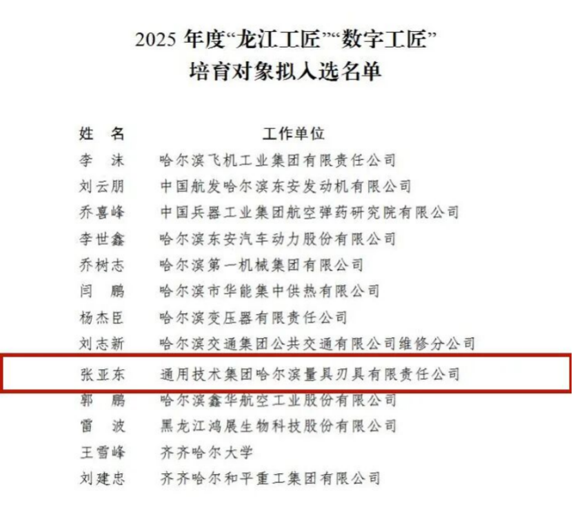 近日,黑龍江省總工會正式公布2025年“龍江工匠”培育對象名單,通用技術(shù)哈量公司數(shù)控刀具廠張亞東成功入選。