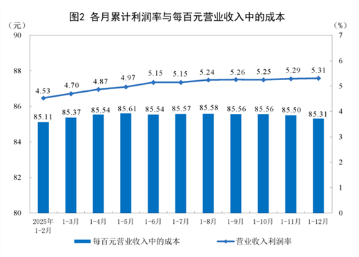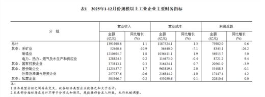2025年,規(guī)模以上工業(yè)企業(yè)實現營業(yè)收入139.20萬億元,比上年增長1.1%;發(fā)生營業(yè)成本118.75萬億元,增長1.3%;營業(yè)收入利潤率為5.31%,比上年下降0.03個百分點。