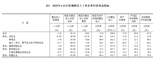 2025年末,規(guī)模以上工業(yè)企業(yè)每百元資產實現的營業(yè)收入為75.9元,比上年末減少2.7元;人均營業(yè)收入為188.9萬元,比上年末增加5.5萬元;產成品存貨周轉天數為19.9天,比上年末增加0.6天;應收賬款平均回收期為67.9天,比上年末增加3.6天。