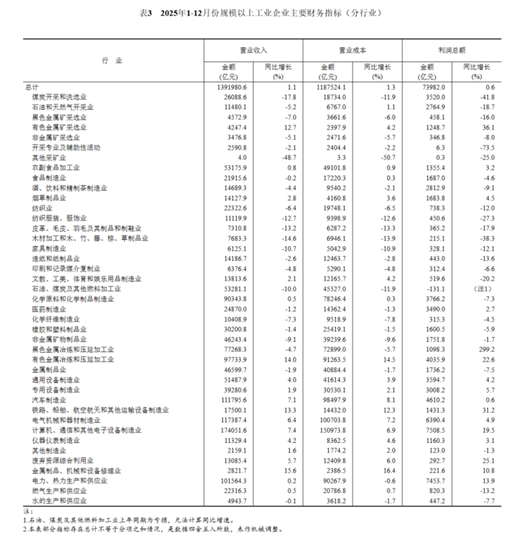 2025年,主要行業(yè)利潤情況如下:黑色金屬冶煉和壓延加工業(yè)利潤比上年增長3.0倍,有色金屬冶煉和壓延加工業(yè)增長22.6%,計算機、通信和其他電子設備制造業(yè)增長19.5%,電力、熱力生產和供應業(yè)增長13.9%,專用設備制造業(yè)增長5.7%,電氣機械和器材制造業(yè)增長4.9%,通用設備制造業(yè)增長4.2%,農副食品加工業(yè)增長3.2%,汽車制造業(yè)增長0.6%,石油、煤炭及其他燃料加工業(yè)比上年減虧,非金屬礦物制品業(yè)下降1.7%,化學原料和化學制品制造業(yè)下降7.3%,紡織業(yè)下降12.0%,石油和天然氣開采業(yè)下降18.7%,煤炭開采和洗選業(yè)下降41.8%。
