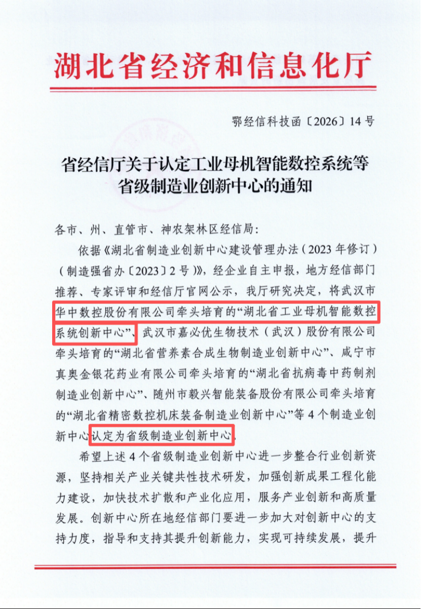 依據(jù)《湖北省制造業(yè)創(chuàng)新中心建設(shè)管理辦法(2023年修訂)(制造強(qiáng)省辦〔2023〕2號(hào))》,經(jīng)企業(yè)自主申報(bào),地方經(jīng)信部門推薦、專家評(píng)審和經(jīng)信廳公示,我廳研究決定,將武漢市華中數(shù)控股份有限公司牽頭培育的“湖北省工業(yè)母機(jī)智能數(shù)控系統(tǒng)創(chuàng)新中心”等4個(gè)制造業(yè)創(chuàng)新中心認(rèn)定為省級(jí)制造業(yè)創(chuàng)新中心。
