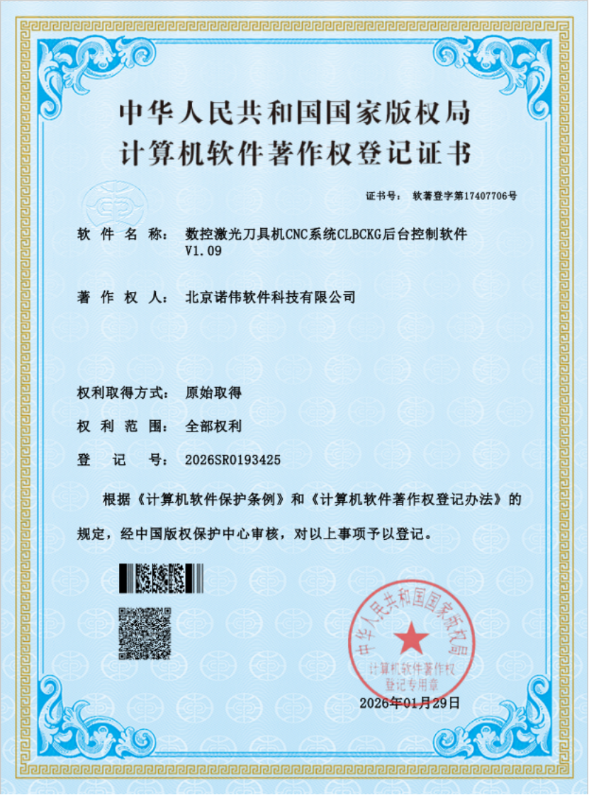 近日,由安德建奇旗下子公司——北京諾偉軟件科技有限公司完全獨(dú)立自主研發(fā)的 “數(shù)控激光刀具機(jī)CNC系統(tǒng)CLBCKG后臺(tái)控制軟件V1.09” ,正式獲得中華人民共和國(guó)國(guó)家版權(quán)局頒發(fā)的 《計(jì)算機(jī)軟件著作權(quán)登記證書(shū)》(證書(shū)號(hào):軟著登字第17407706號(hào),登記號(hào):2026SR0193425)。這是對(duì)我司堅(jiān)持原始創(chuàng)新、自主攻關(guān)技術(shù)路線的又一權(quán)威認(rèn)可。