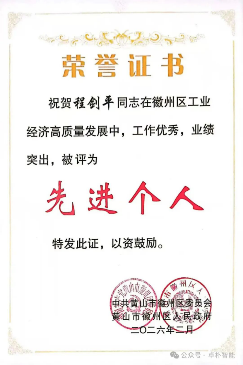 【機床商務(wù)網(wǎng)欄目 名企在線】2月5日,徽州區(qū)2025年度工業(yè)經(jīng)濟高質(zhì)量發(fā)展先進集體和先進個人評選表彰大會召開。區(qū)委書記汪長劍出席講話,區(qū)委副書記、區(qū)長王蘇平主持,區(qū)四大班子領(lǐng)導(dǎo)及相關(guān)單位、企業(yè)代表出席。安徽卓樸智能裝備股份有限公司(以下簡稱“卓樸智能”)獲評先進集體,公司技術(shù)總監(jiān)程劍平榮獲先進個人稱號,彰顯卓樸風(fēng)采與責(zé)任擔(dān)當(dāng)。